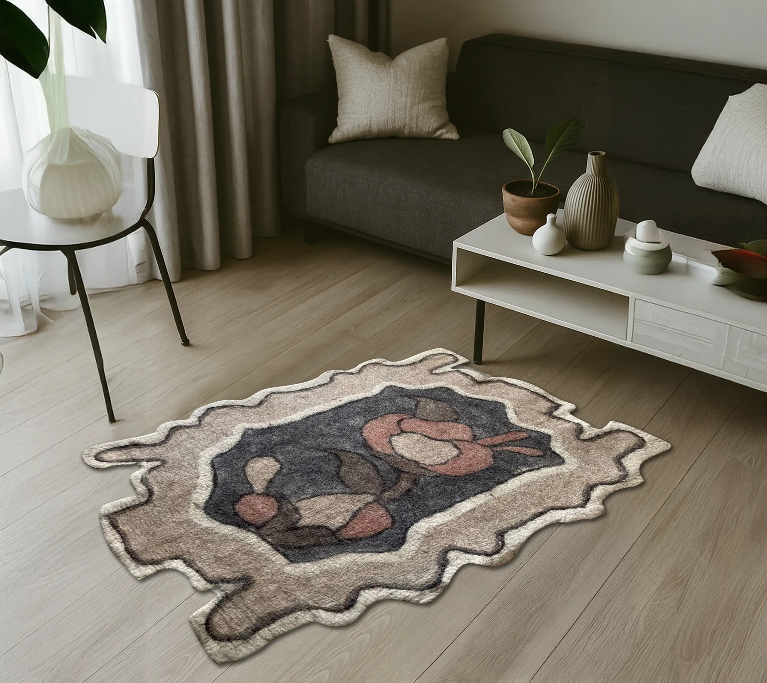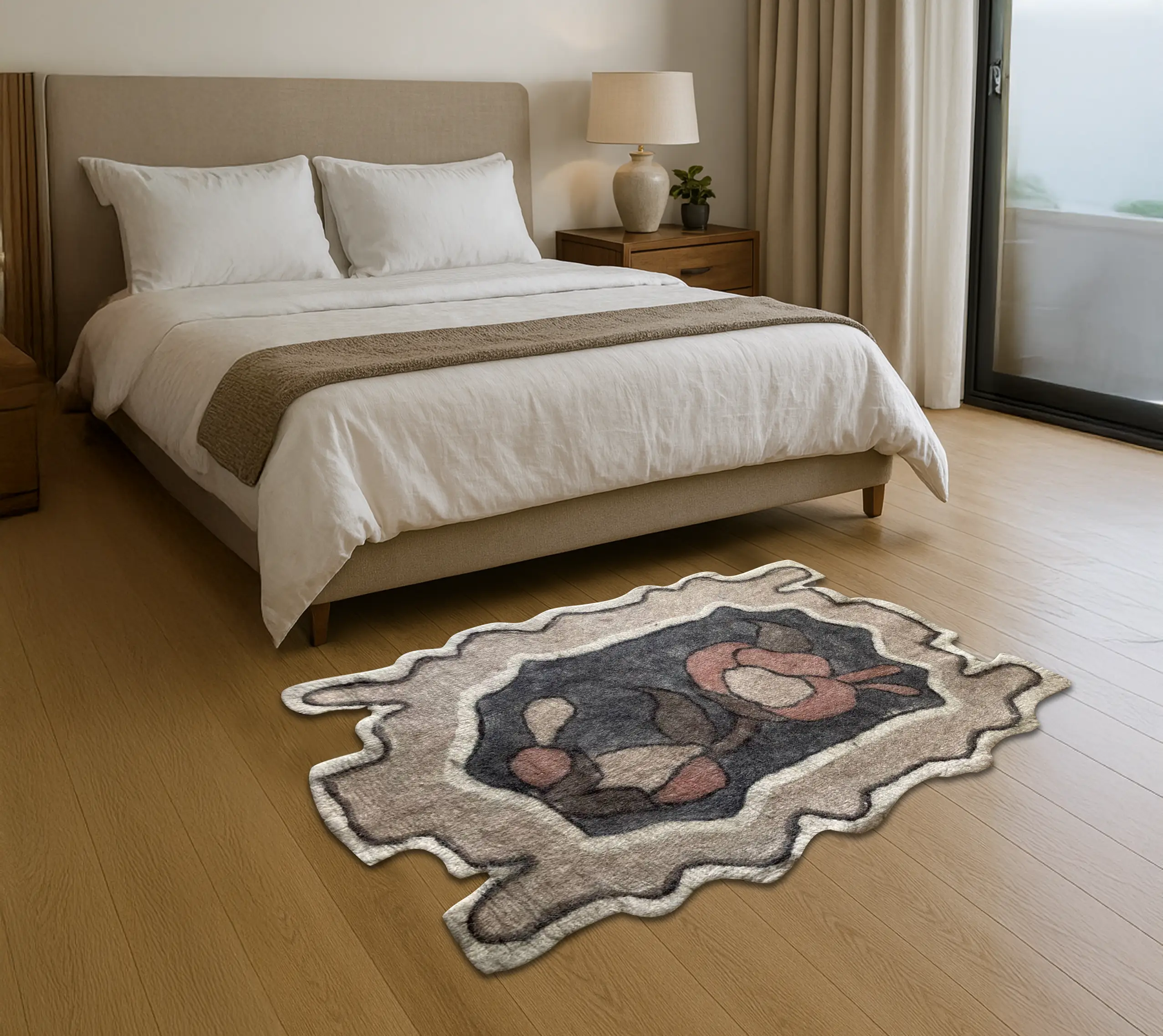"گلگونه" (در معنی لغوی یعنی مانند گل، به رنگ گل، یا رخساره سرخ) نامیست بر این اثر که در آن، گل نه به شکل سنتی و طبیعی، بلکه در هیئتی نو و دگرگونشده ظاهر شده است. کادری آزاد، با خطوطی نامنظم و فرمهایی که از قواعد کلاسیک فاصله گرفتهاند، بستری شده برای تولد گلی مدرن؛ گلی که ریشه در خیال دارد، نه در باغ. واژهی «گلگونه» ترکیبیست از «گل» و «گونه»؛ هم به معنای گونهای از گل، و هم به معنای شباهتی شاعرانه به لطافت و رنگ چهره. این نمد، پیوندیست میان طبیعت و فرم، سنت و نوآوری، و در عین سادگی، حامل حس زندگیست؛ گلی که در دل نمد روییده تا جهان را از زاویهای تازه نگاه کند.